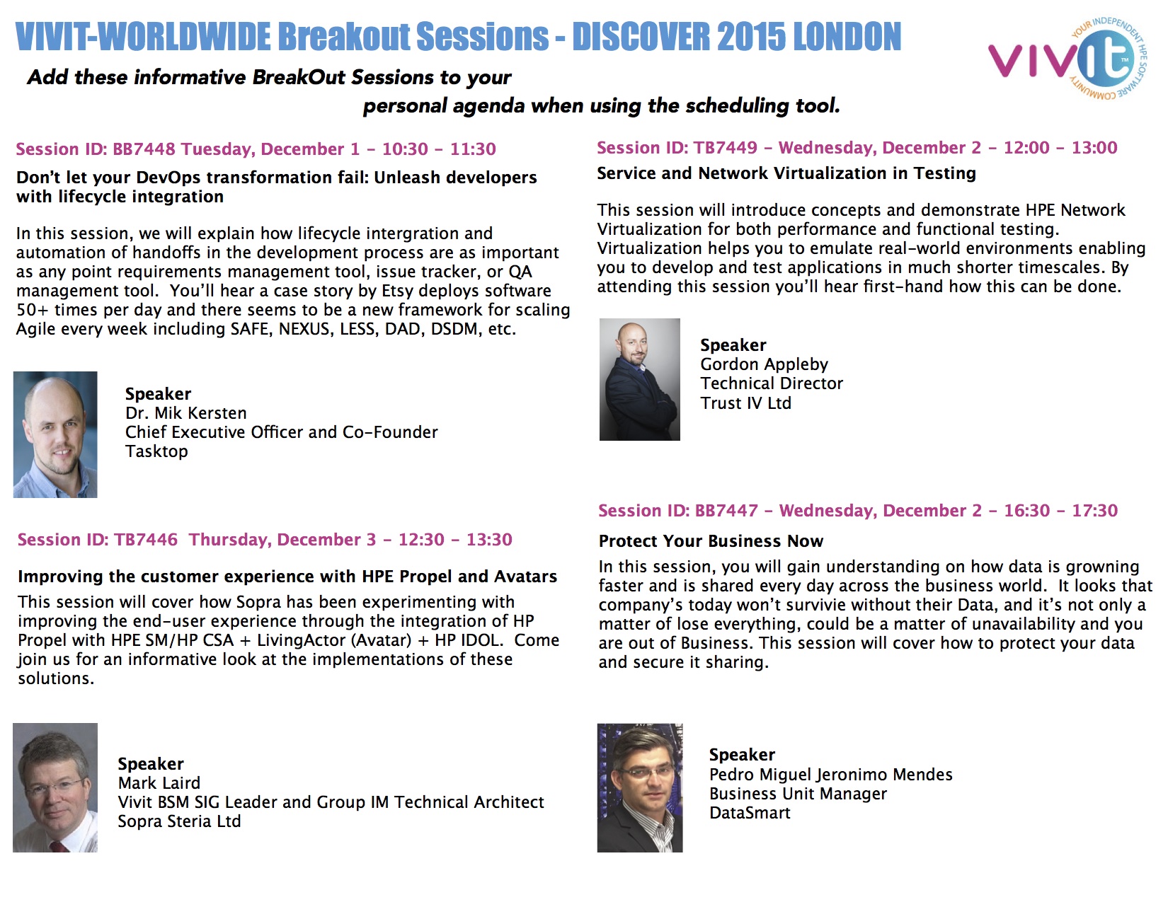Vivit is proud to announce we will have four breakout sessions listed in the catalog this year. These breakout session topics focus on Big Data, Application Development Management Strategy, Security and Automation/Cloud Management and will surely provide great knowledge to all who attend.