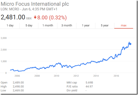 What really changed the game was Chris Hsu, who will be CEO. He did a bang-up job of kicking off the event on day one. His story was crisp, the strategy was clear and he did an excellent job of being forward looking while not trying to hide the fact many of the assets of the combined company are very much legacy assets. Legacy assets with really good cashflow. He was unapologetic about the fact that Cobol would be a significant revenue stream in the new business, and Micro Focus has done a phenomenal job recently of driving up revenues and share price from 2011-2016 – comparable with the performance of Amazon, Facebook or Microsoft in that time frame.